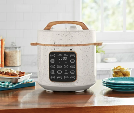 The Pioneer Woman 6 Qt Pressure Cooker,Linen Speckle,Wood Grain, Blinking Display, Touch Control